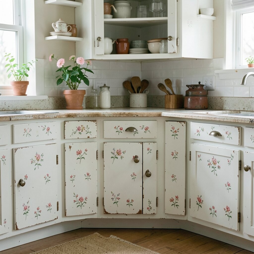Use a few fresh flowers or a small herb pot to match the mood. Hand-painted details may cost more, but decal accents or stencils can give you a similar look for less.