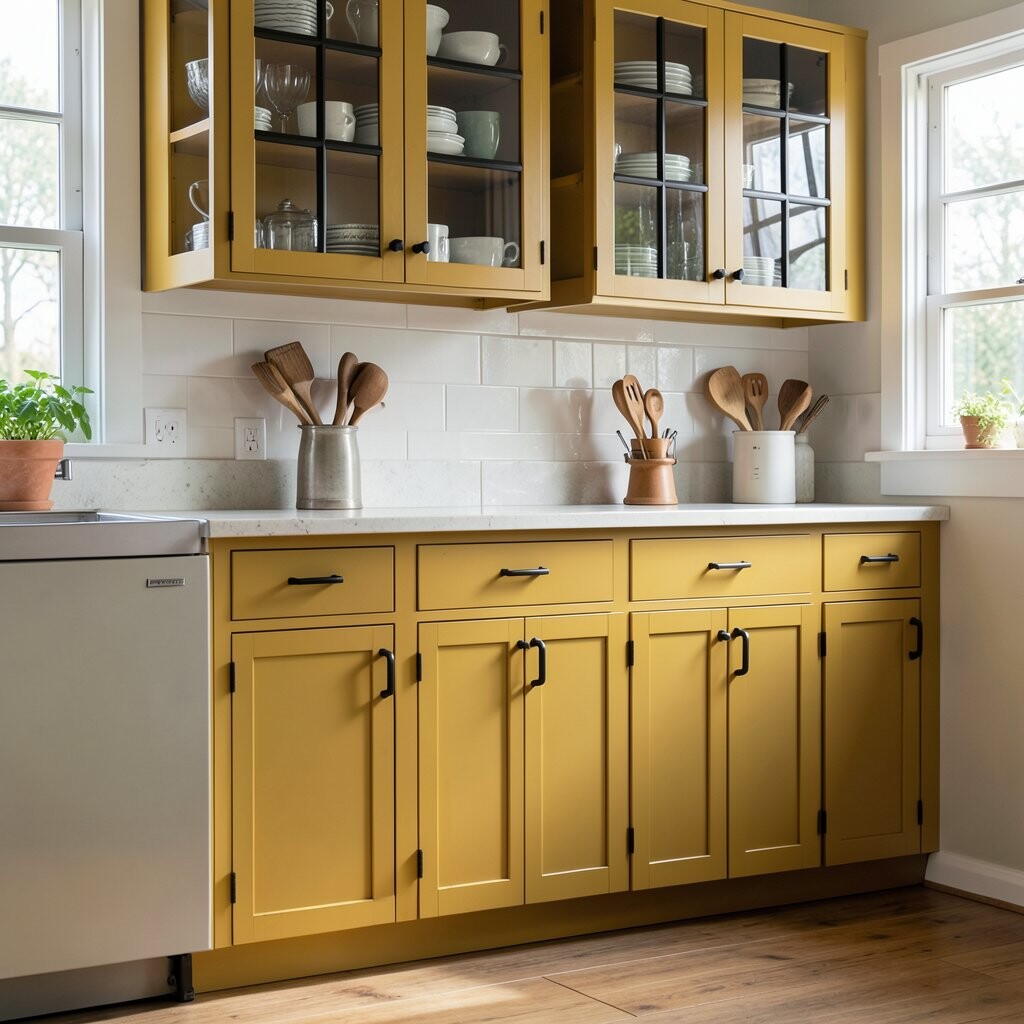 Mustard cabinets feel bold, warm, and very retro. Black grid glass on nearby doors or upper cabinets adds a nice old-time look.