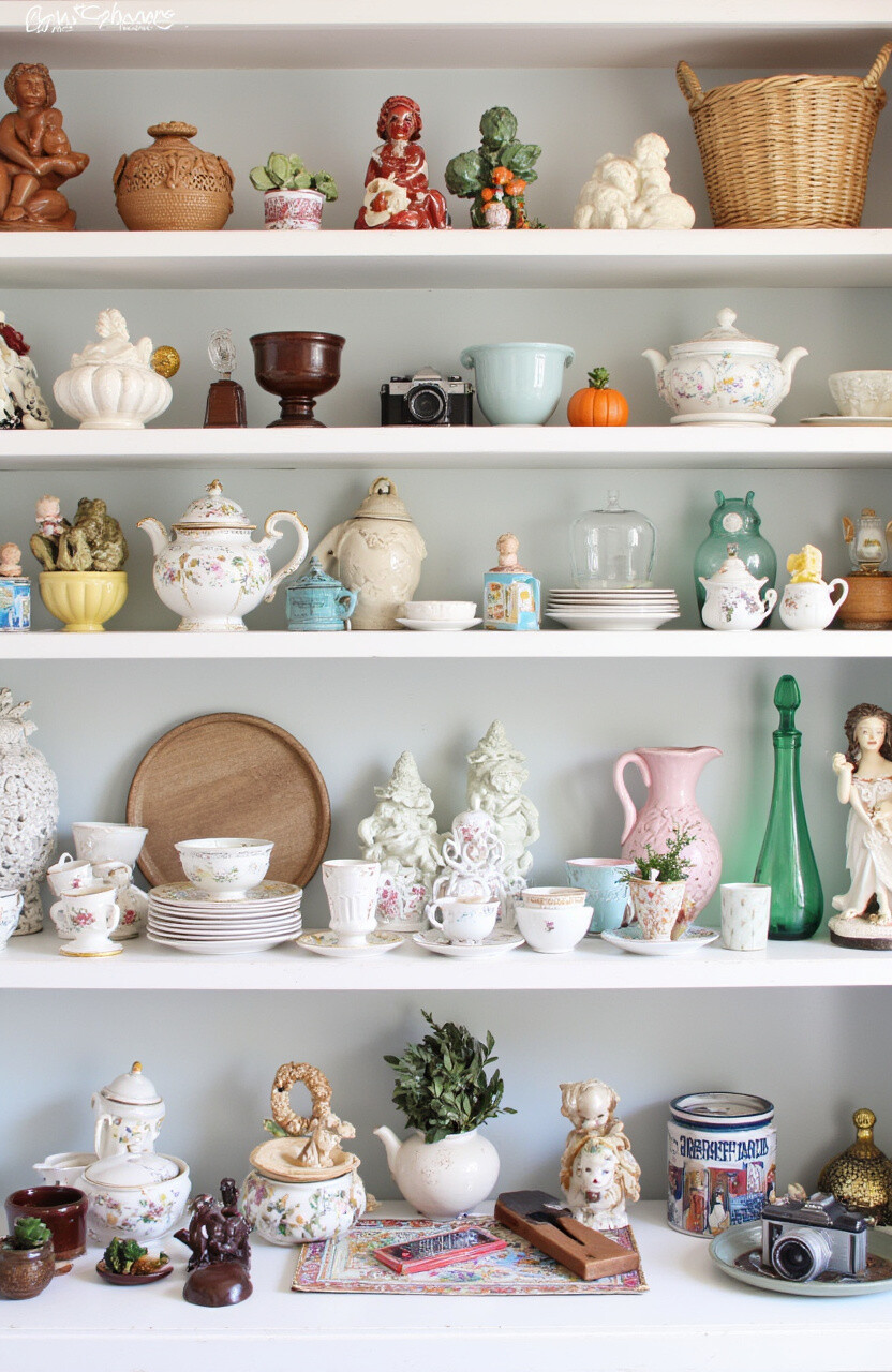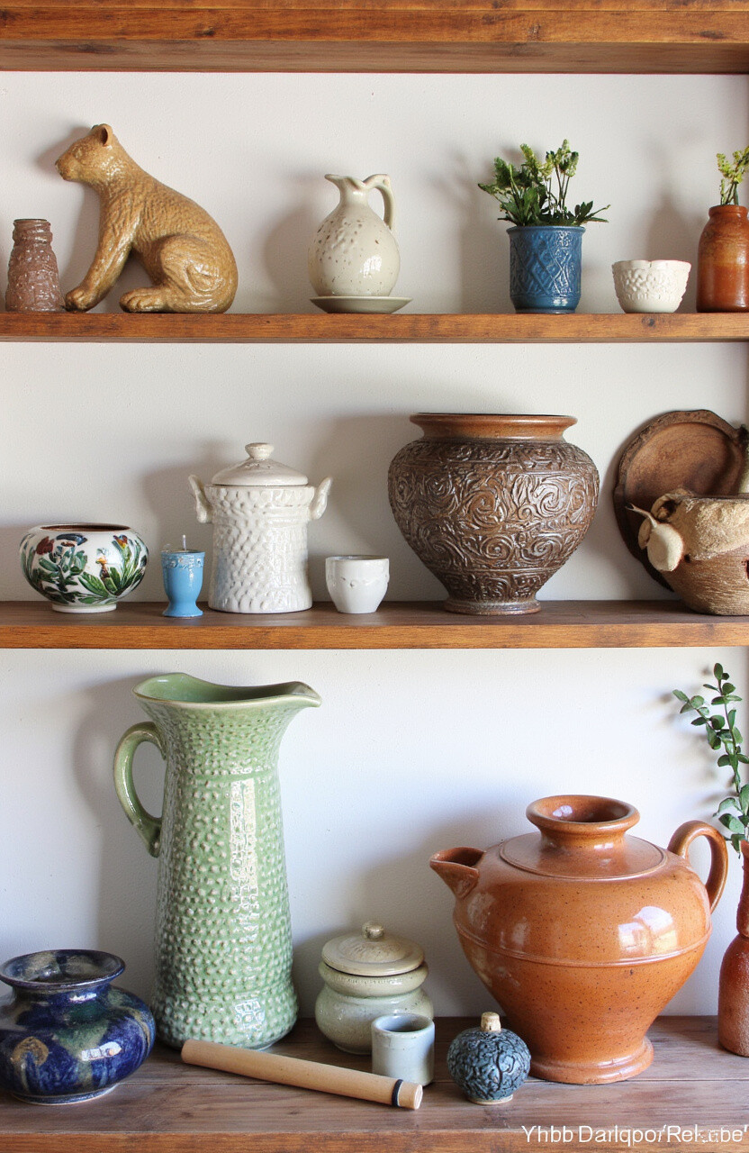 Pottery adds an artisanal touch to your shelf. Vintage pieces often have unique shapes and colors. They add a rustic and earthy feel to your display.