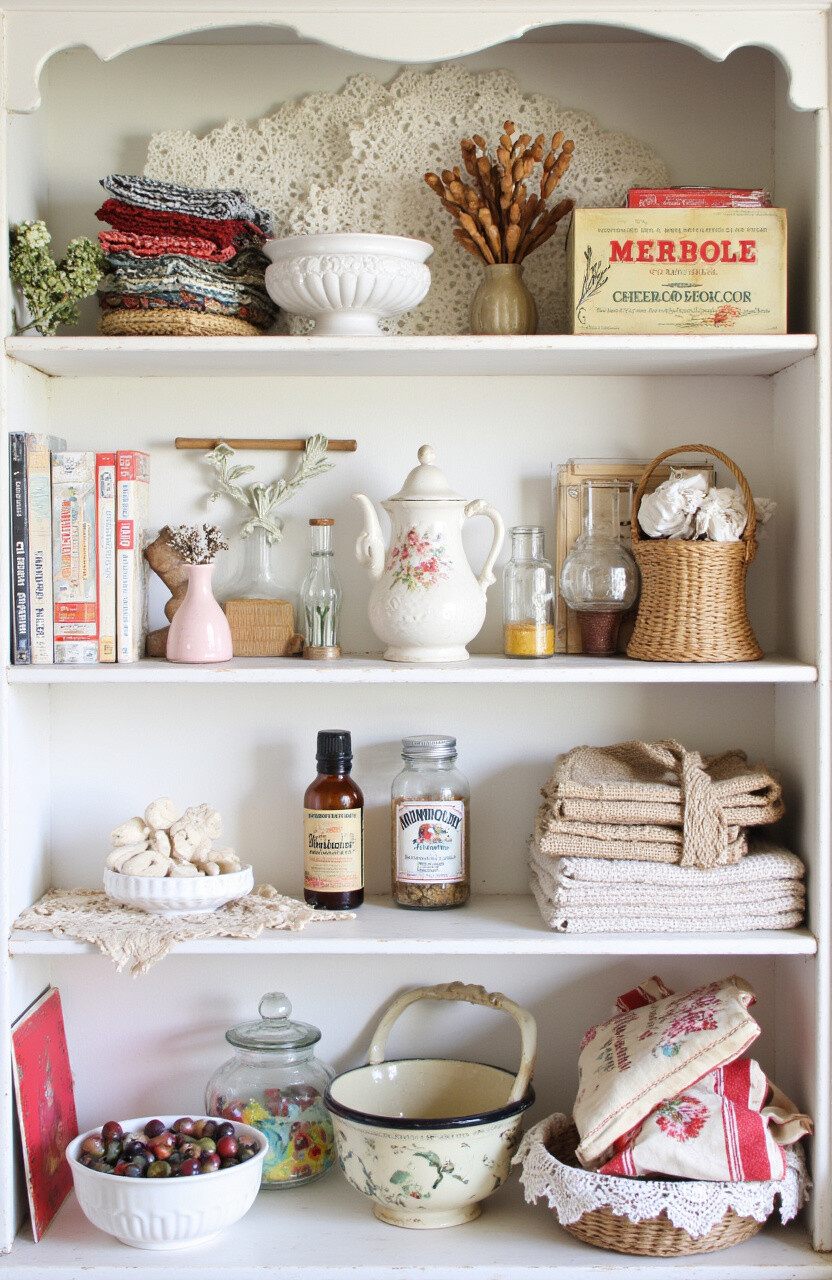 Add texture by using vintage textiles like doilies, lace, or small quilts. Layer them on your shelf for depth and warmth. Textiles soften the look of your vintage display.