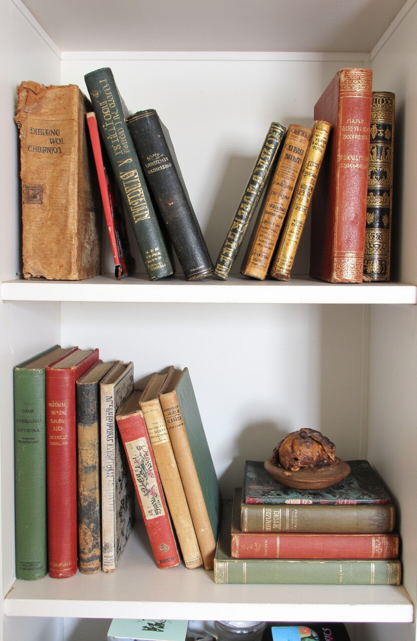 Antique books are not just for reading; they’re perfect for styling. Stack them horizontally and vertically for a dynamic look. The varied spine colors add a beautiful spectrum to your shelf.