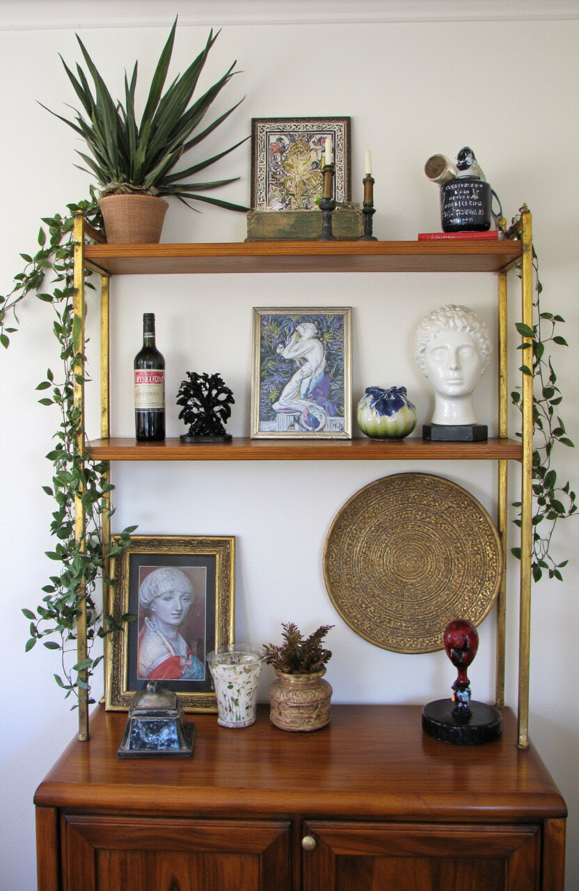 Plants bring life and freshness to your vintage shelf. Small potted plants or succulents are ideal. Their greenery contrasts beautifully with the warm tones of vintage materials.