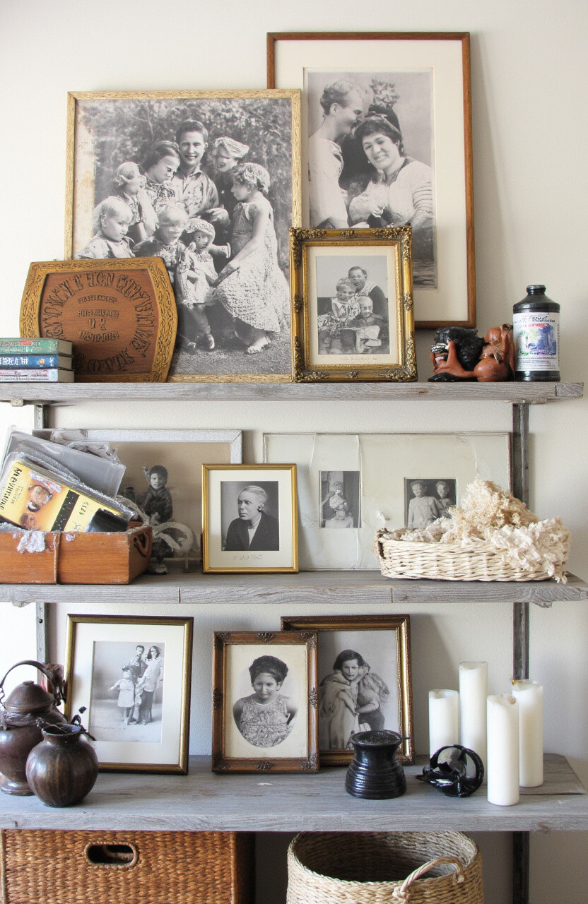 Old frames can be found easily at antique shops. Each frame tells its own story, enhancing the overall charm of your shelf. Personal photos make your space uniquely yours.