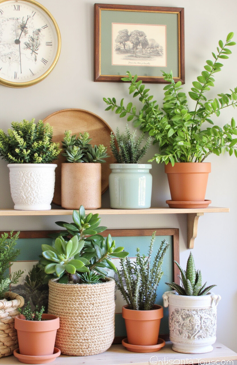 Try using terracotta pots for a rustic look. They’re inexpensive and add a natural feel to your display. Plus, caring for plants can be a relaxing hobby!