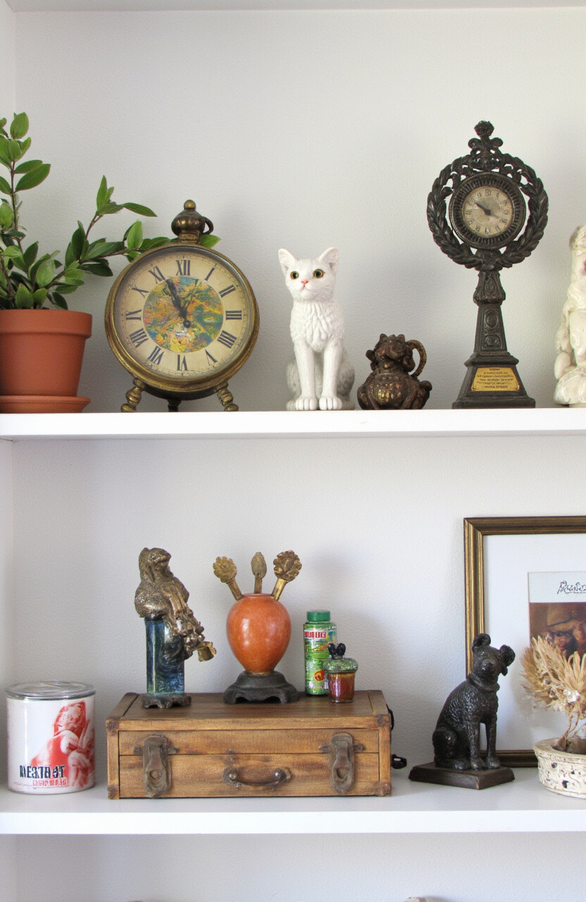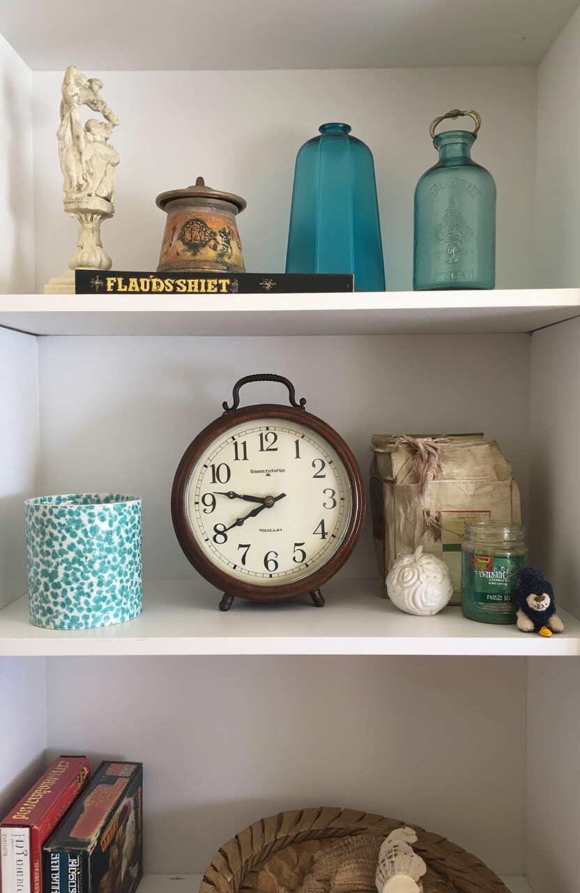 Small, vintage trinkets add character to your shelf. Think of old keys, small sculptures, or antique clocks. These items are conversation starters and add a whimsical touch.