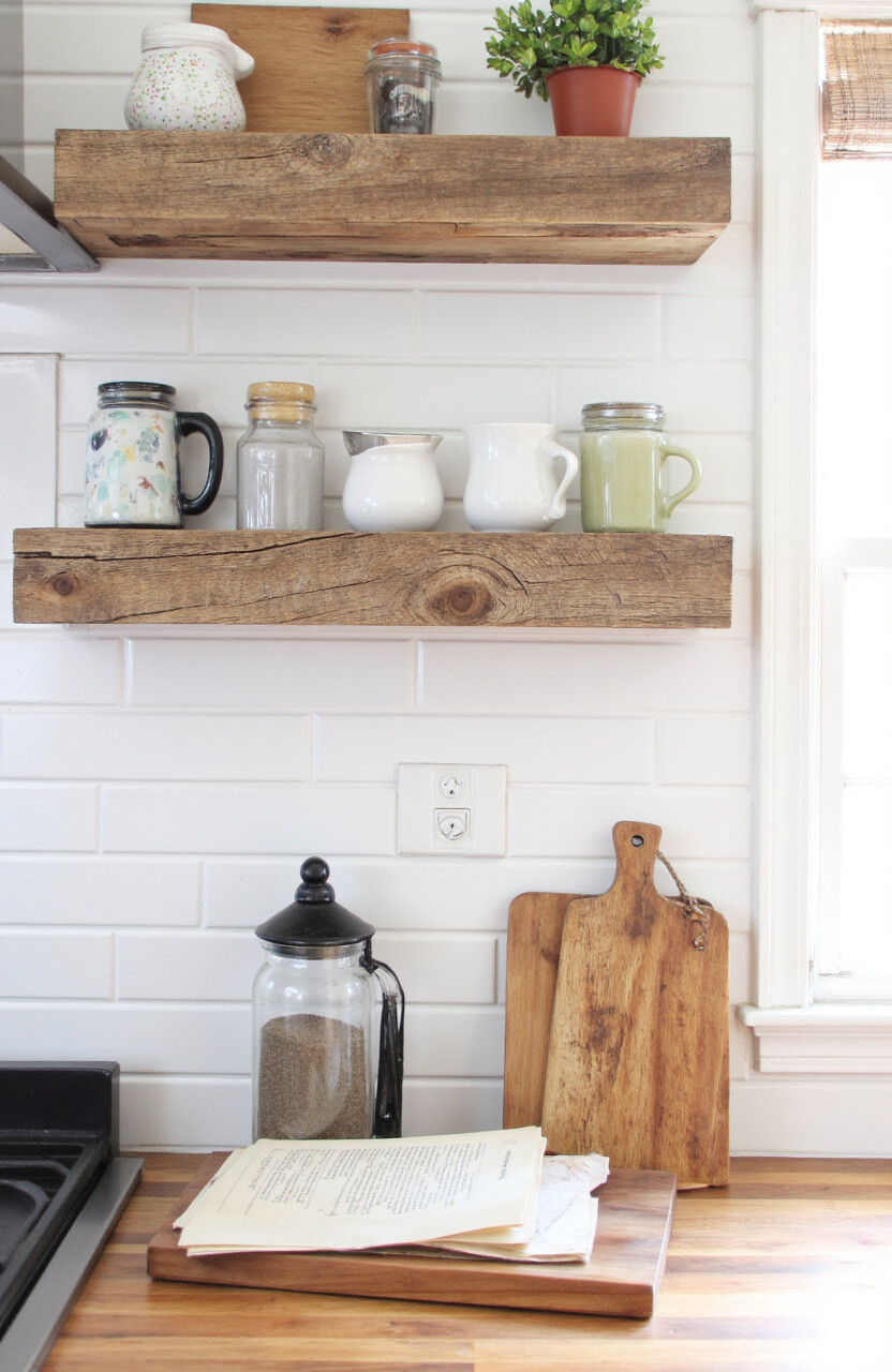 Imagine placing rustic wooden shelves in your kitchen. These shelves can hold your favorite mugs, spices, or even tiny plant pots. The rough texture of reclaimed wood adds a warm, earthy feel.