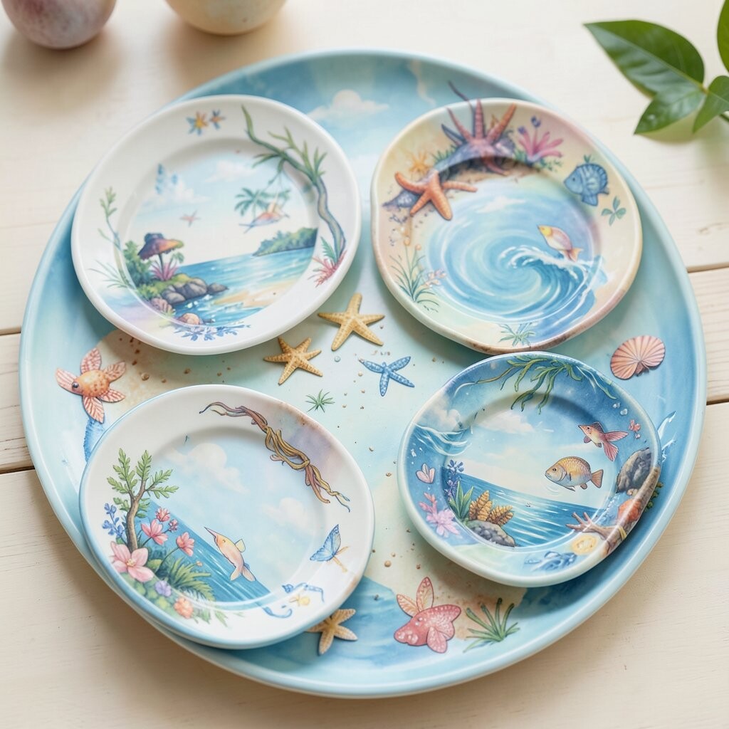 Feel the call of the sea with ocean-themed plates. Seashells, waves, and marine life can transform your dining table into an underwater escape.