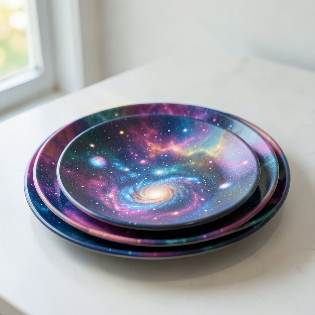 Go beyond the usual with plates that boast cosmic colors. Think deep blues, purples, and sparkling silvers that mimic the night sky.