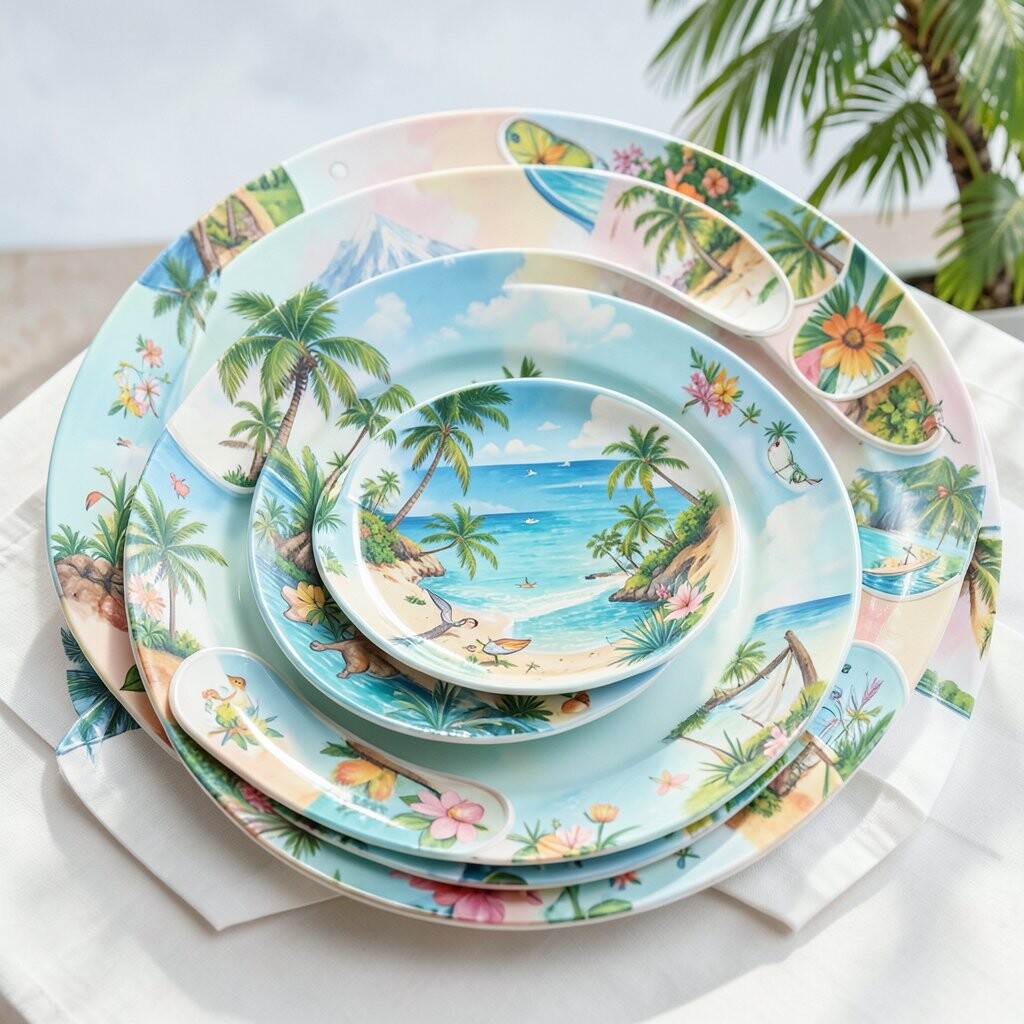 Bring the beach to your dining room with tropical-themed plates. Imagine bright colors, palm leaves, and exotic flowers decorating your table.