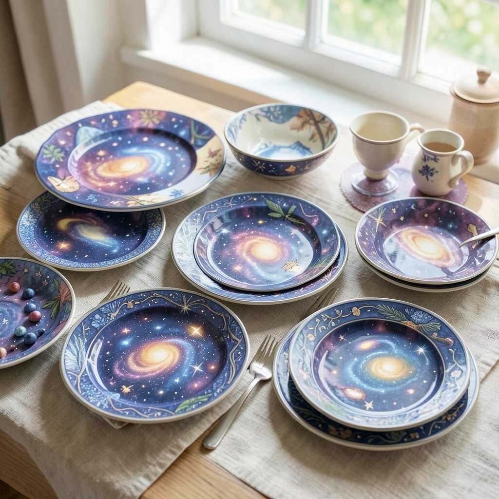 Dream of stars, moons, and galaxies with celestial-themed plates. These designs can make your dining experience feel magical and otherworldly.