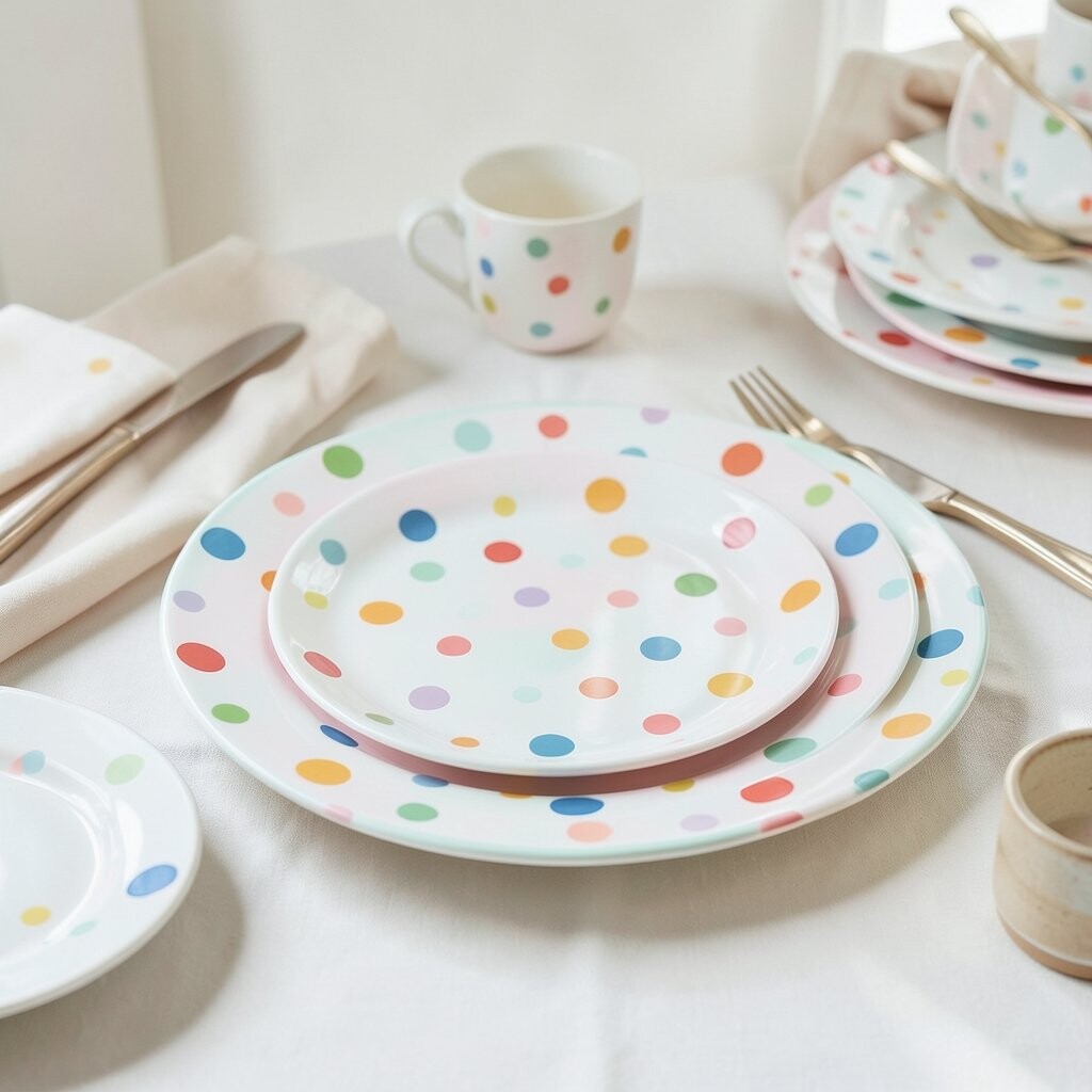 Mix and match colors for a fun, eclectic look. Polka dot plates are widely available and budget-friendly, making them a great choice for every home.