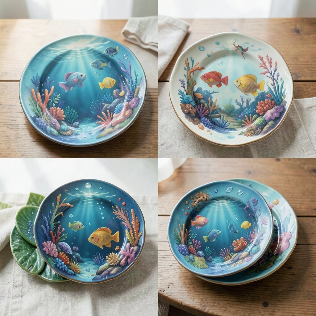 Explore the depths of the ocean with plates that depict underwater scenes. Imagine coral reefs, colorful fish, and mysterious sea creatures.