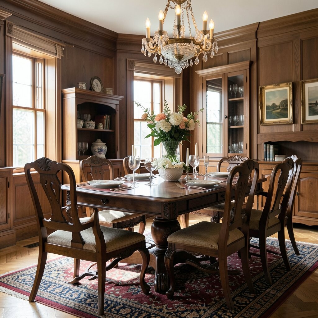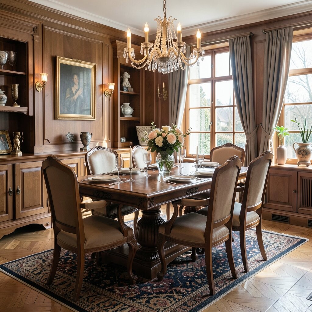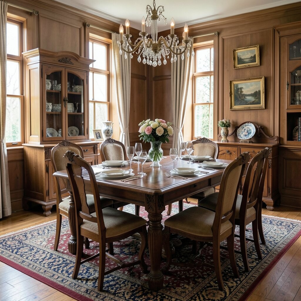 Step into the grandeur of the Victorian era with an elegant dining room. A dark wooden table with intricate carvings and upholstered chairs create a regal space. It’s perfect for those who love opulence and detail.