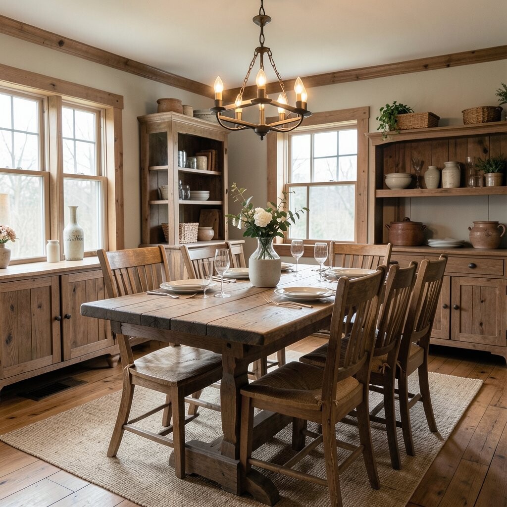 A rustic farmhouse dining room is all about warmth and comfort. Imagine a large wooden table with a distressed finish surrounded by mismatched wooden chairs. The beauty lies in its imperfections, making it feel like home.