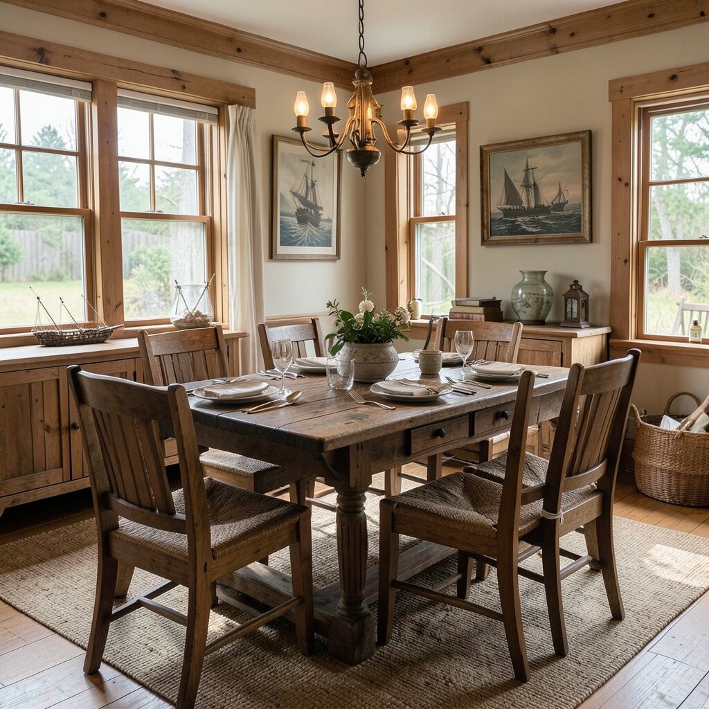 Set sail on a nautical adventure with a maritime-inspired dining room. A wooden table with rope details and navy accents creates a coastal vibe. It’s perfect for those who love the sea and maritime decor.