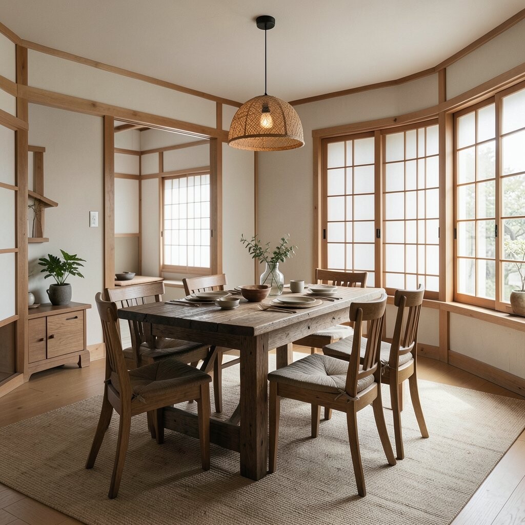 Find peace and tranquility with a Japanese-inspired dining room. A low wooden table with simple, clean lines and minimalist chairs create a serene space. It’s perfect for those who appreciate simplicity and balance.