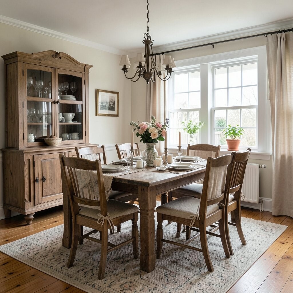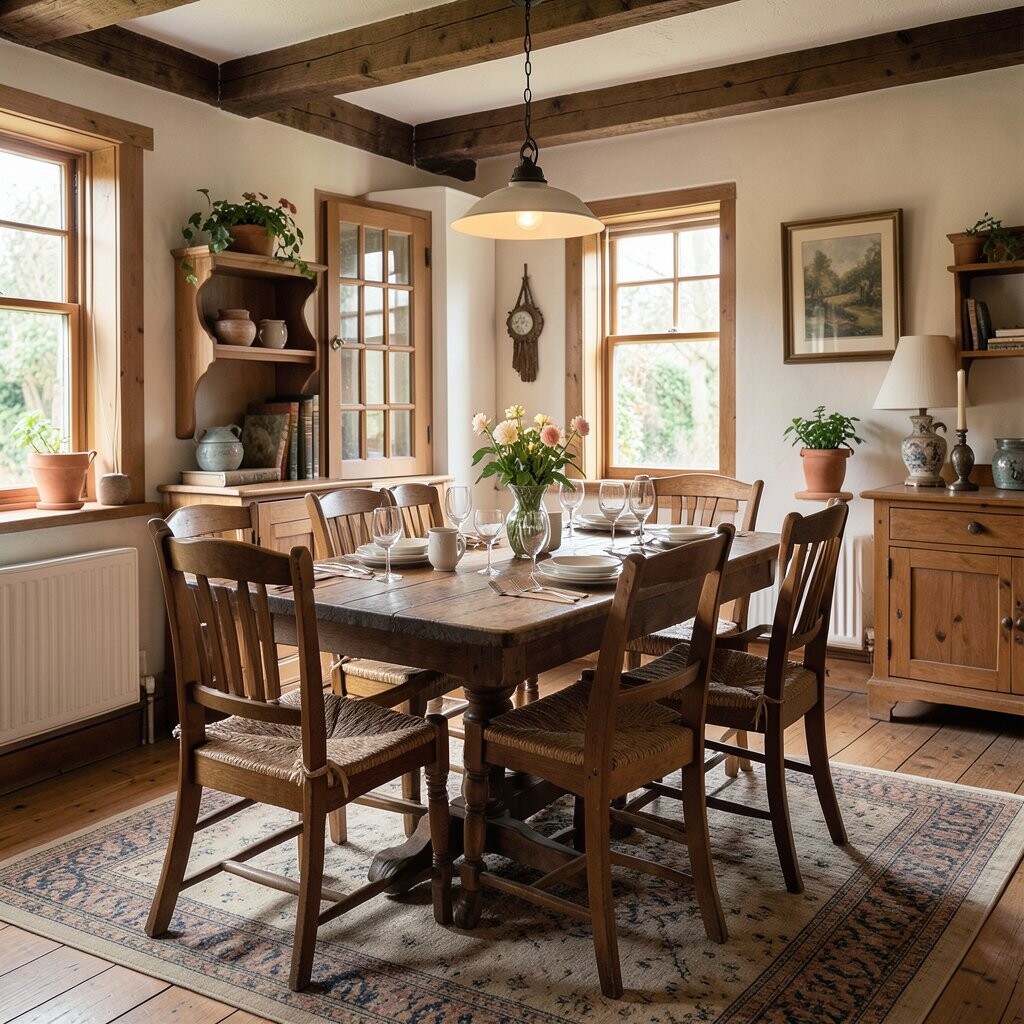 Invite the charm of the English countryside into your home with a cottage-style dining room. A wooden table with a natural finish paired with cozy chairs creates a welcoming space. Soft colors and floral patterns enhance the cottage feel.