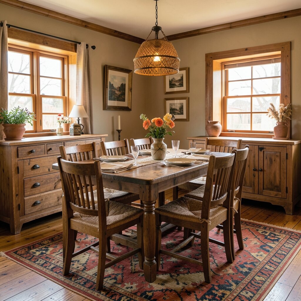 Embrace the warmth of the desert with a Southwestern-style dining room. A wooden table with rustic finishes and colorful chairs create a cozy space. It’s perfect for those who love earthy tones and natural materials.