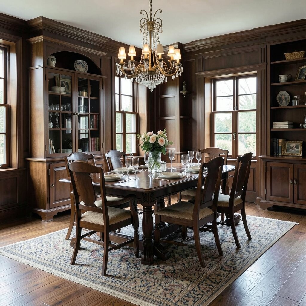 Embrace the elegance of the past with a colonial-style dining room. A large wooden table with elaborate carvings and sturdy chairs create a grand space. It’s perfect for formal dining and special occasions.