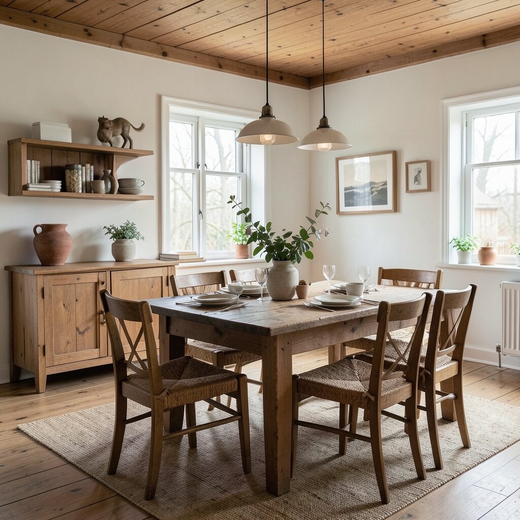 Scandinavian design is known for its simplicity and functionality. A light wooden dining table paired with minimalist chairs creates an airy, peaceful space. It’s a great choice for those who love a clean, uncluttered look.
