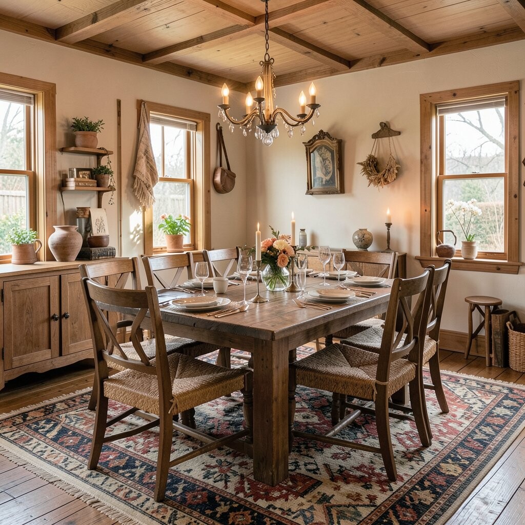 This style is perfect for families who love casual dinners and long conversations. Add vintage tableware and soft linens to enhance the cozy feel. You can easily find affordable pieces at flea markets or antique shops, making it a budget-friendly option.