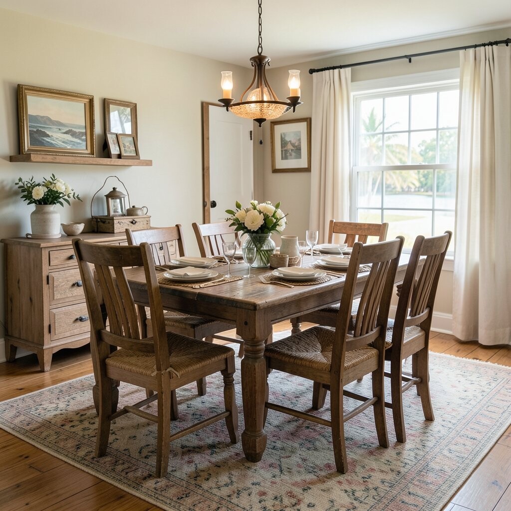 Embrace the calmness of the sea with a vintage coastal dining room. A whitewashed wooden table with light, airy fabrics creates a serene space. It’s perfect for those who love the ocean and beachy vibes.