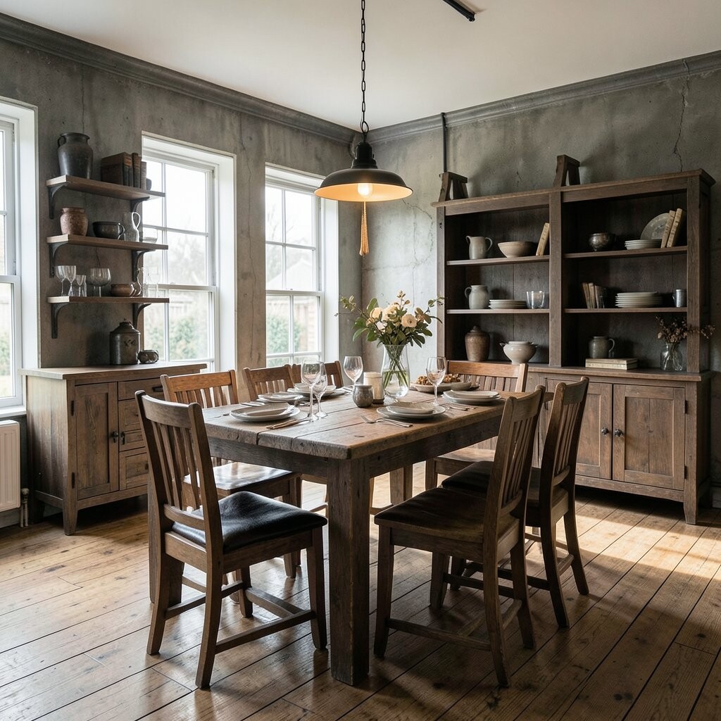 Combine the rawness of industrial design with vintage charm for a unique dining room. A sturdy wooden table with metal accents creates an edgy yet warm atmosphere. It’s perfect for urban lofts or modern homes.