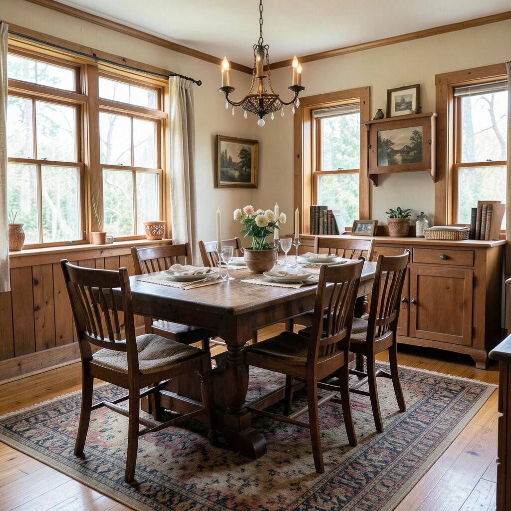 The Arts and Crafts movement celebrates craftsmanship and simple forms. A solid wooden dining table with handcrafted details showcases this style beautifully. It’s perfect for those who value quality and artisanal work.