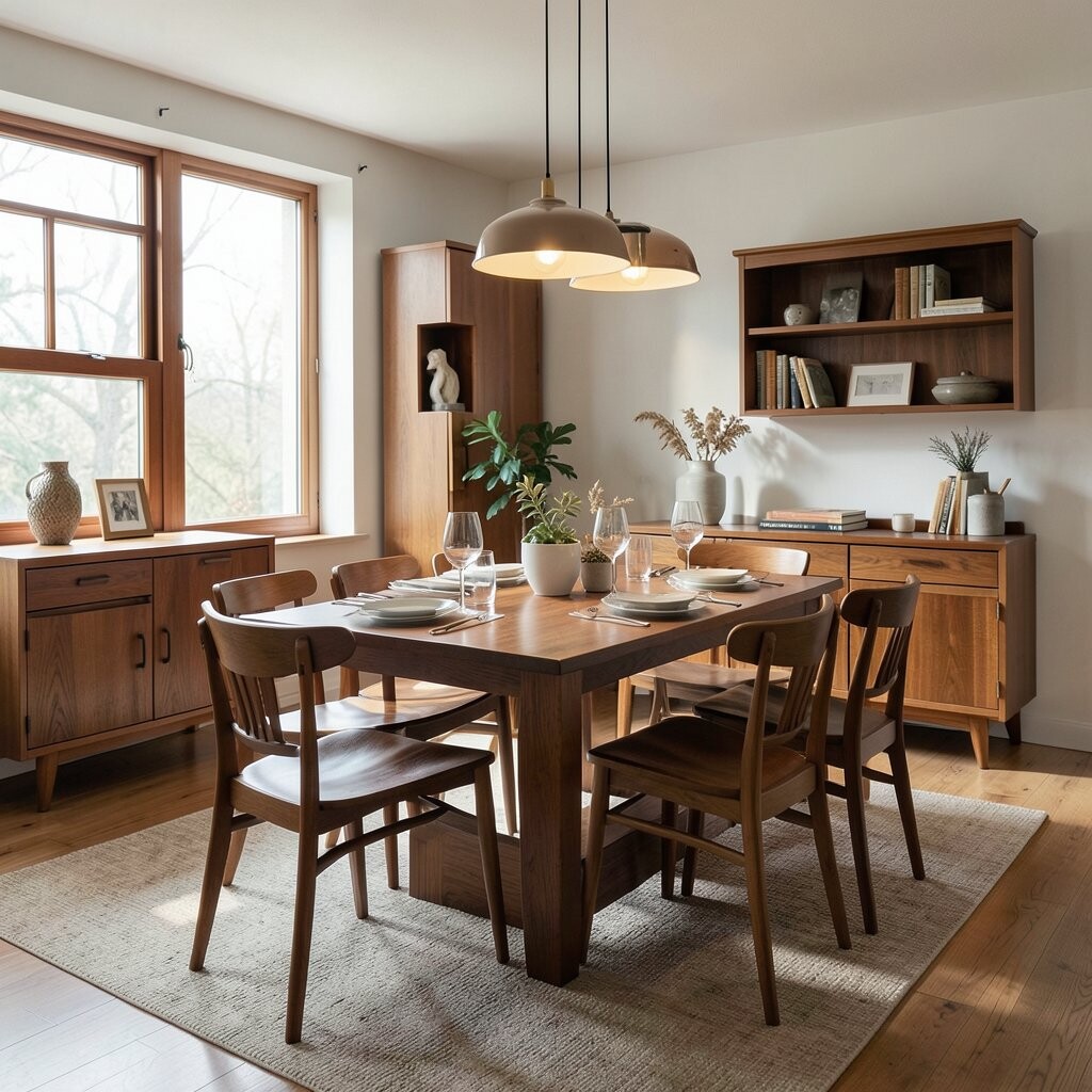 Mid-century modern design is all about clean lines and minimalism. A wooden dining table with tapered legs paired with sleek chairs can instantly elevate your dining room. It’s a timeless style that blends vintage and modern seamlessly.